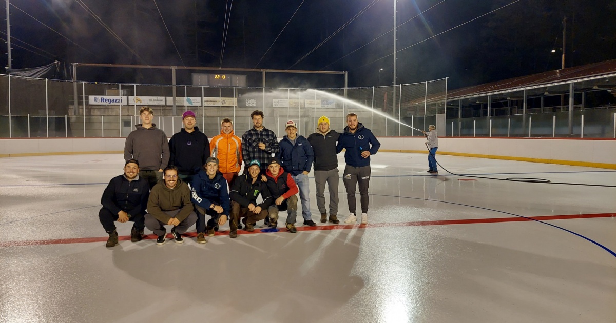 I ragazzi della Prima Squadra dell'Hc Valle Verzasca si sono alternati per gettare acqua sulla piastra. Riparte la stagione sui pattini