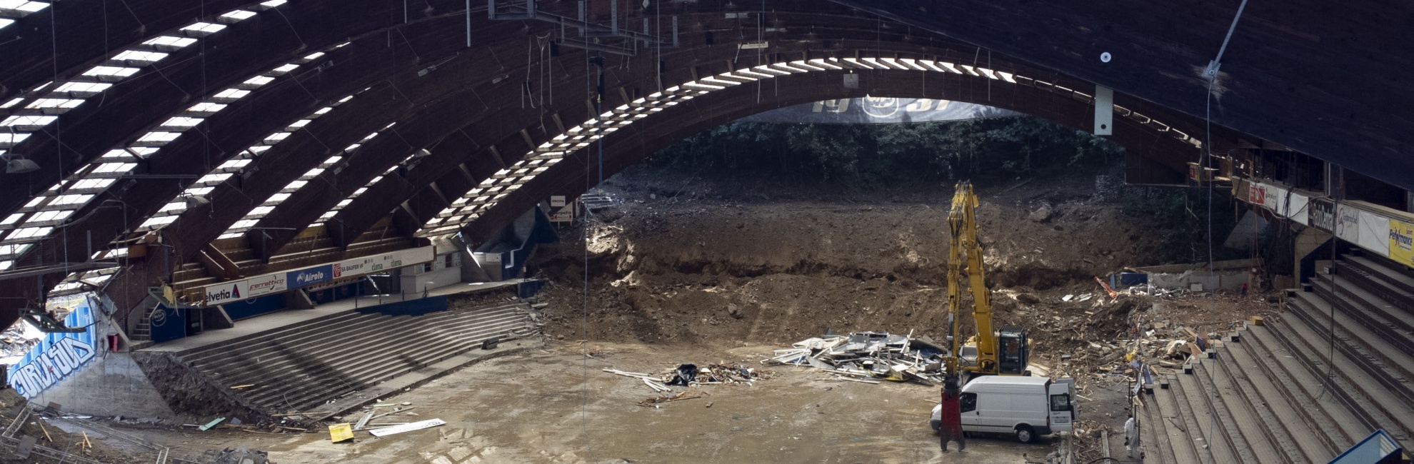 Il primo simbolico colpo di ruspa le era stato sferrato il 7 luglio da un commosso presidente Filippo Lombardi, in bilico fra il desiderio di lasciarsi alle spalle un capitolo glorioso ma che ha fatto il suo tempo, e l’intima necessità di non separarsene mai, come fanno quelle persone che accumulano l’inverosimile nel tentativo di ancorare sé stesse e ciò che rappresentano alla vita terrena prolungandola all’eternità. Trascorse due settimane, il nostro obiettivo è tornato alla Valascia di Ambrì per testimoniare l’avanzare dei lavori di smantellamento. Sono immagini che non lasciano indifferenti, specie quelle generazioni di tifosi che dalla Curva Sud – ormai demolita gradone per gradone – hanno, inverno dopo inverno, testimoniato, cantato e urlato il loro affetto e calore per l’Hcap vittorioso e sconfitto nella pista di ghiaccio coperta più fredda della Svizzera.