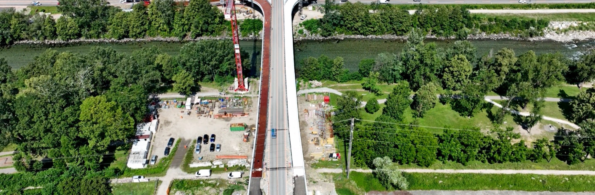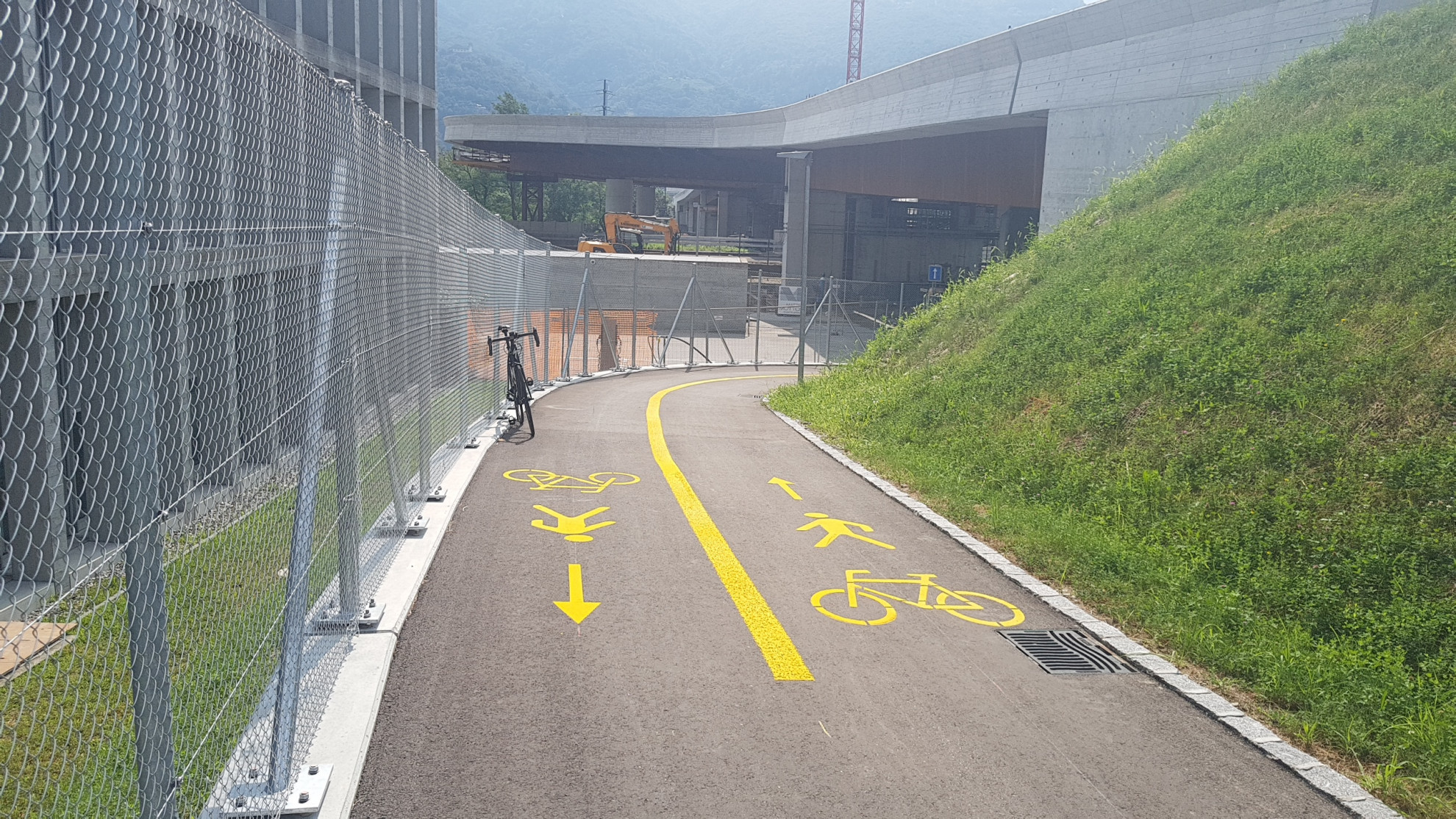 Sempre in questi giorni iniziano a intravedersi i nuovi collegamenti ciclo-pedonali che completeranno il manufatto, passandovi accanto e sotto, interconnettendo così le passerelle della Torretta e di Monte Carasso-Semine. Da alcuni giorni, ad esempio, è in funzione il primo tracciato che da Carasso, una volta lasciato il ponte della Torretta, conduce sotto il semisvincolo e prosegue fino al campo sportivo di Monte Carasso. Nel frattempo è stato chiuso ai pedoni e alle bici il passaggio pedonale che attraversando via Tatti collegava via Luini a via Borromini (quartiere delle Semine). Alcuni pedoni devono ancora abituarsi a utilizzare i tragitti alternativi demarcati per spostarsi dalle Semine in direzione del centro città e viceversa; e infatti si ostinano a percorrere il tratto di cantiere a loro rischio e pericolo, nonostante le indicazioni fornite sul posto dal personale di sicurezza.