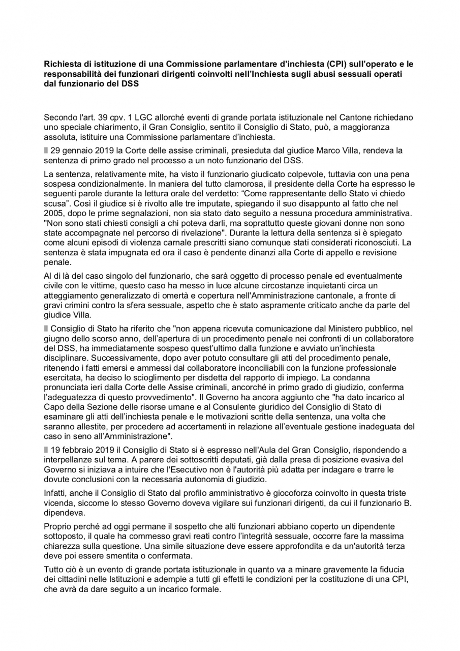 Istituire una Commissione parlamentare d'inchiesta (Cpi) sul caso dell'ex funzionario del Dss condannato in primo grado per coazione sessuale. Questa è la richiesta interpartitica inoltrata oggi all'Ufficio presidenziale del Gran Consiglio, per fare luce sul caso dell'ex operatore sociale del cantone. Secondo i richiedenti "proprio perché ad oggi permane il sospetto che alti funzionari abbiano coperto un dipendente sottoposto, il quale ha commesso gravi reati contro l’integrità sessuale, occorre fare la massima chiarezza sulla questione. Una simile situazione deve essere approfondita e confermata o smentita da un'autorità terza".