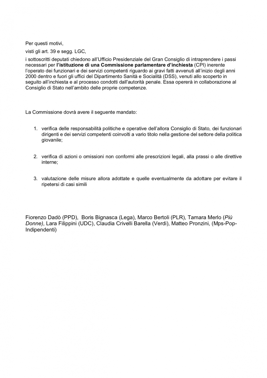 "Già dalla presa di posizione evasiva del Governo nell'Aula del Gran Consiglio dello scorso 19 febbraio si iniziava a intuire che l'Esecutivo non è l'autorità più adatta per indagare e trarre le dovute conclusioni con la necessaria autonomia di giudizio" sostengono Fiorenzo Dadò (PPD), Boris Bignasca (Lega), Marco Bertoli (PLR), Tamara Merlo (Più Donne), Lara Filippini (UDC), Claudia Crivelli Barella (Verdi), Matteo Pronzini, (Mps-Pop-Indipendenti), firmatari della richiesta.
