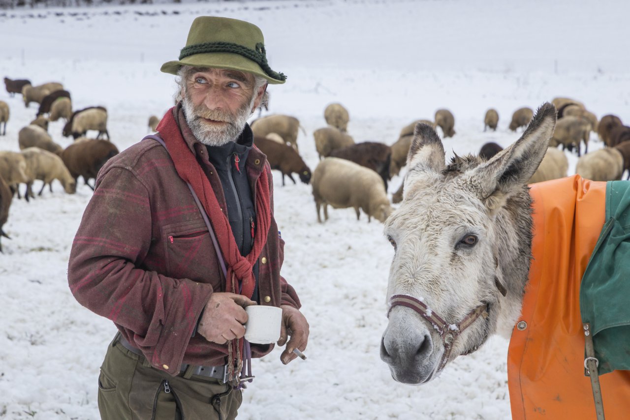 Tre cani lo aiutano a spostare il gregge e a tenerlo insieme. "Addestrare i cani da pastore è un lavoro impegnativo che mi da gioia”. E poi ci sono i tre asini, anche loro fedeli. Ne parla con affetto: “Sono cresciuti con me, sono i miei compagni di lavoro, senza di loro non potrei fare tutto questo”. Trasportano ciò di cui il pastore ha bisogno durante la giornata: provviste, termos del caffè e vino, vestiti di ricambio, stivali, medicine per le pecore e un generatore di corrente per il recinto degli ovini.