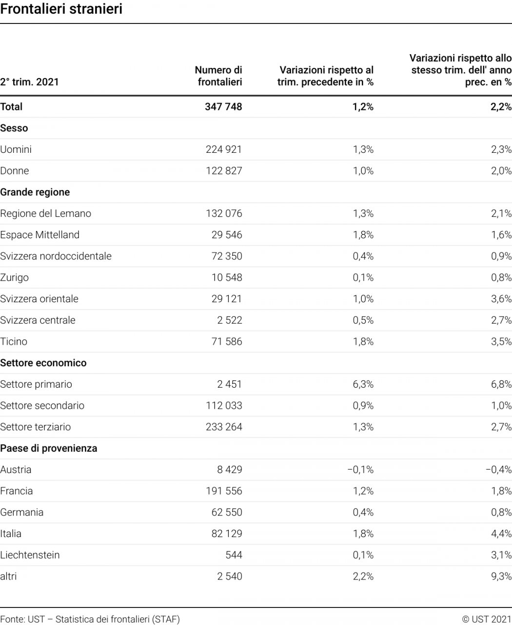 L’Ust sottolinea che la statistica dei frontalieri (Sfaf) è stata oggetto di una revisione che ha comportato il ricalcolo dei risultati a partire dal 2019. I risultati di questo periodo rimangono provvisori. Le fonti della Staf sono il Sistema d'informazione centrale sulla migrazione (Simic), i dati dell'AvsS, la banca dati della formazione professionale iniziale e, per le serie precedenti al IV trimestre 2010, la Statistica dell’impiego (Statimp).
