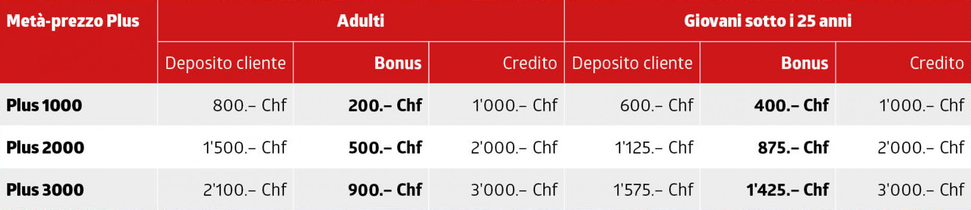 Una sorta di credito prepagato insomma. Considerando per esempio l’opzione metà-prezzo Plus 1000, l’utente paga 800 franchi e riceve un bonus di 200 franchi avendo quindi a disposizione un credito di 1000 franchi con il quale acquistare i titoli di trasporto. Lo stesso discorso vale per le versioni 2000 e 3000 che prevedono rispettivamente un bonus di 500 e 900 franchi. In altre parole, maggiore è il credito, maggiore è il bonus.