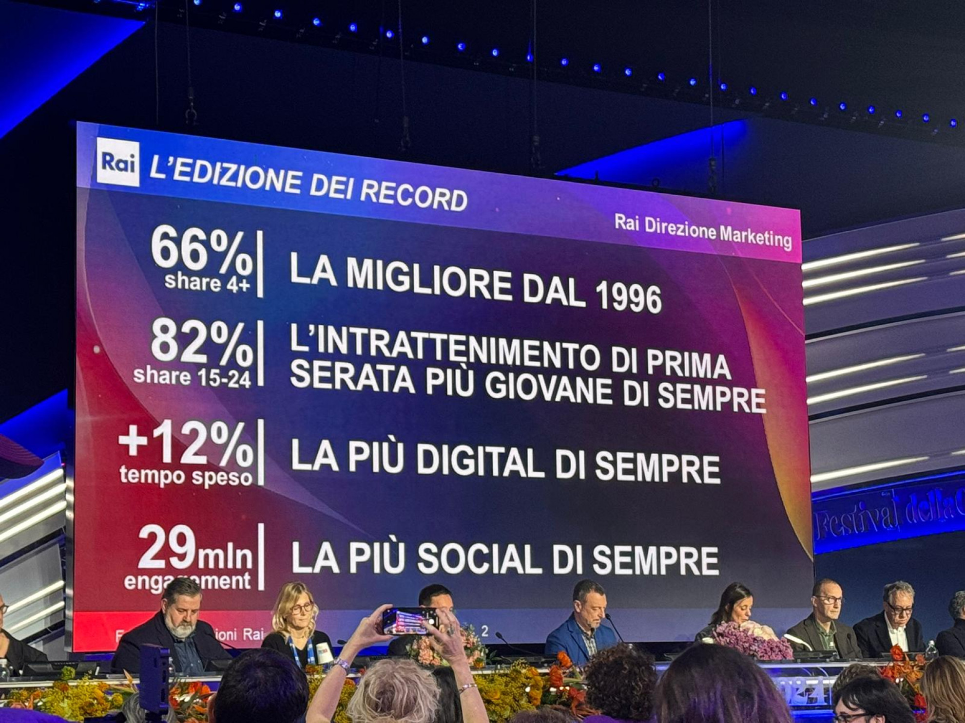 È l'ultima conferenza. Il 74% di share, 14 milioni di ascoltatori, è il miglior risultato dal 1995. L'intera edizione 2024 ha fatto registrare il 66% di share con incrementi di vario tipo rispetto alle precedenti, dentro e fuori l'Ariston. ‘Fuori’ inteso come il ‘viva Rai2!’ festivaliero di Fiorello, che è già in viaggio e, al telefono, saluta e ringrazia in diretta.