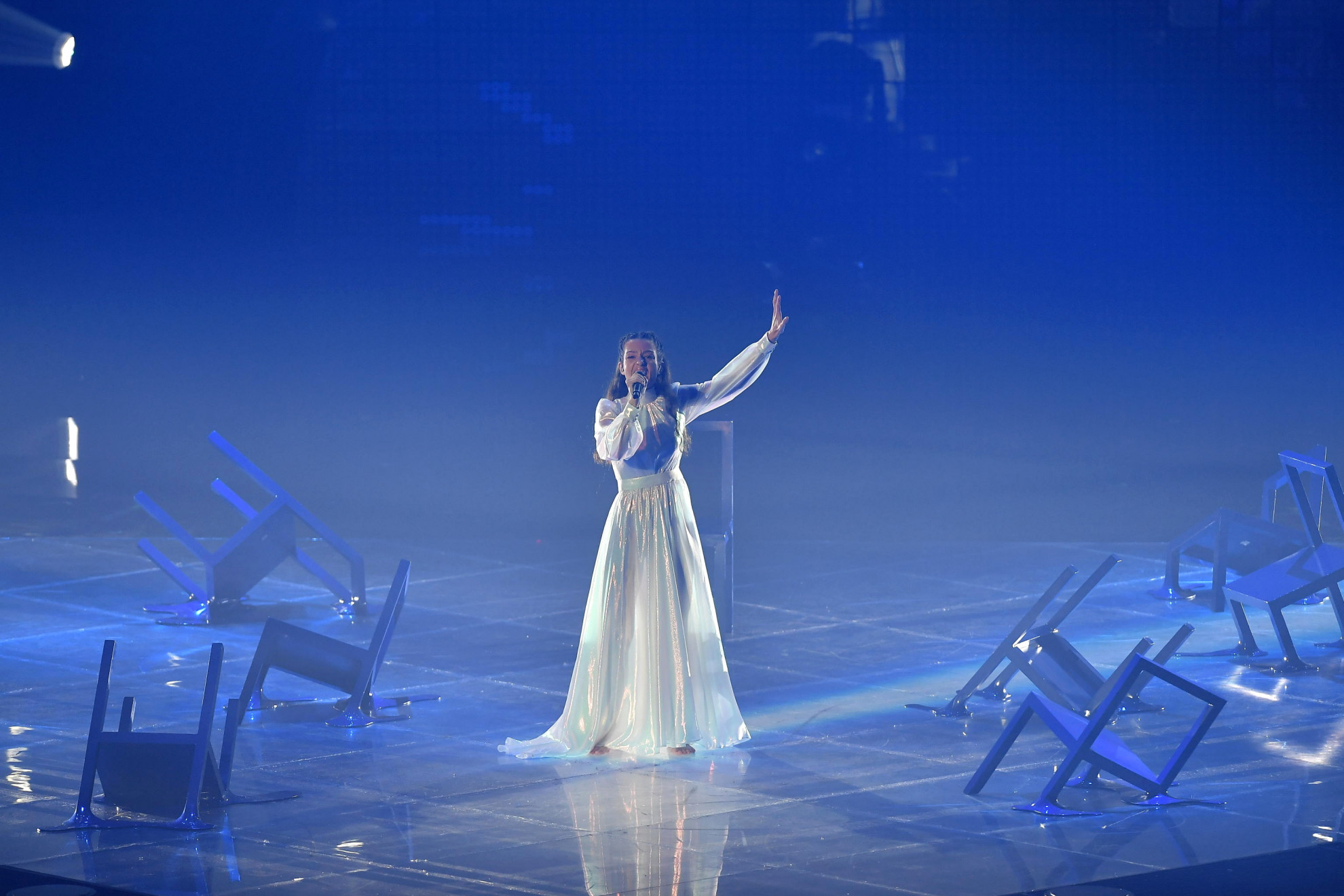 È da brividi, e la canzone non c’entra, il ‘Give Peace A Chance’ che porta dalle piazze di Torino al PalaOlimpico, che batte le mani a tempo con la buonanima di John Lennon. La Finale è cominciata. Apre Laura Pausini di bianco vestita, con medley che va da ‘Benvenuto’ a ‘Scatola’. Sfilano i concorrenti, poi Mika grida "Make some noise" e lo show si accende sullo spettacolo di luce di ‘Lights Off’ dei cechi We Are Domi; così accade anche per il beatmaker WRS in ‘Llàmame’, rumeno dal prodotto musicale latino. MARO, pupilla di Jacob Collier, abbassa i toni nel bell’impasto di voci che è ‘Saudade, saudade’, il Portogallo tra world music, new age e cantautorato. Il piccolo Ben col palloncino torna da Derry, cittadina di fantasia del Maine, per cantare ‘Jezebel’. Ma sotto l’impermeabile giallo c’è Lauri, frontman dei Rasmus, nella citazione di ‘It’, capolavoro horror di Stephen King. Per i trent’anni di rock finlandese, e per la resa del pezzo, l’applauso è dovuto.