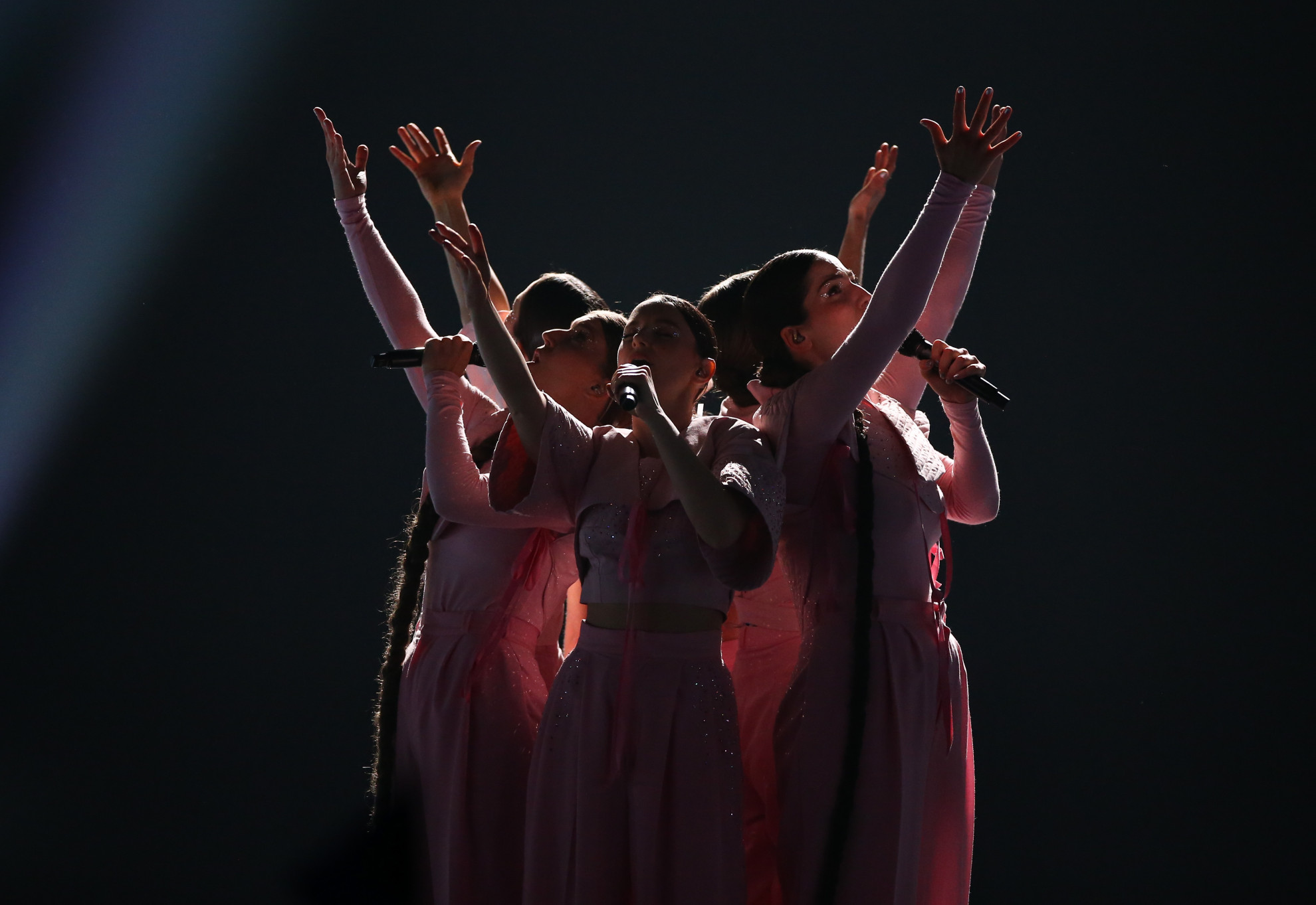 Accompagna la sua esibizione con una manciata di cenni, quel gesticolare italiano che a Torino fu oggetto di celebrazione, ma che a Liverpool ha un senso diverso. Fatta eccezione per l’arrangiamento, una cassa in quattro (mai invasiva) applicata alla strofa, la canzone è quella di Sanremo, e alla Liverpool Arena basta la riproduzione di una superficie lunare e due figure in azione sopra un tappeto elastico a rendere ‘Due vite’ potente come le ballad a volte possono essere, e notturna come un notturno di Chopin. E Marco Mengoni in ginocchio, alla fine dell’interpretazione, sopraffatto dall’emozione è la ragion d’essere del mestiere d’artista.
