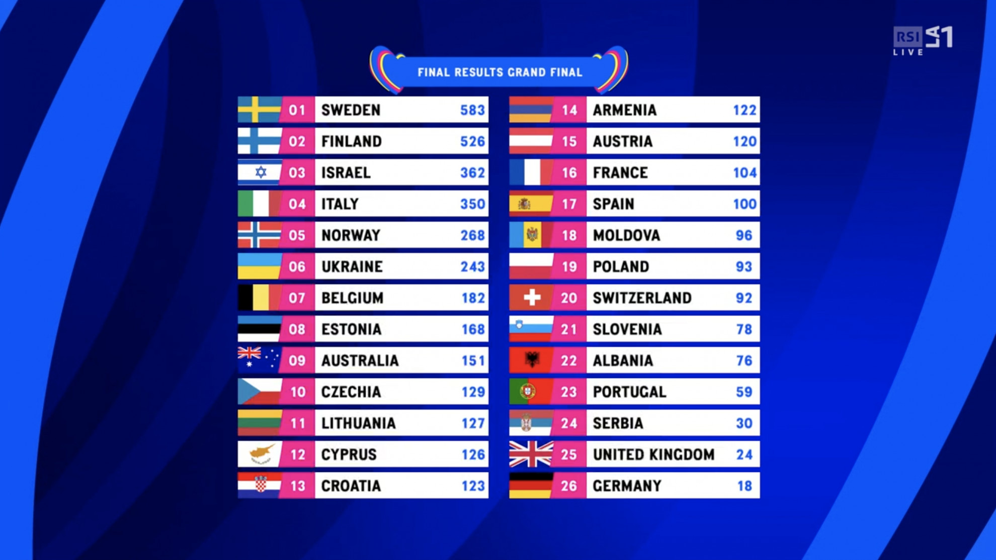 Quella di sabato sera è stata un gara a tre fra Svezia, Italia e Israele, fino al sussulto prodotto dal televoto, capace di catapultare il ‘Cha Cha Cha’ del finlandese Käärijä al secondo posto, scalzando l’Italia di Marco Mengoni con ‘Due vite’, che ha chiuso quarta. Terza, Noa Kirel per Israele con ‘Unicorn’. La Svizzera di Remo Forrer, con la bella ‘Watergun’, ha chiuso solo ventesima.