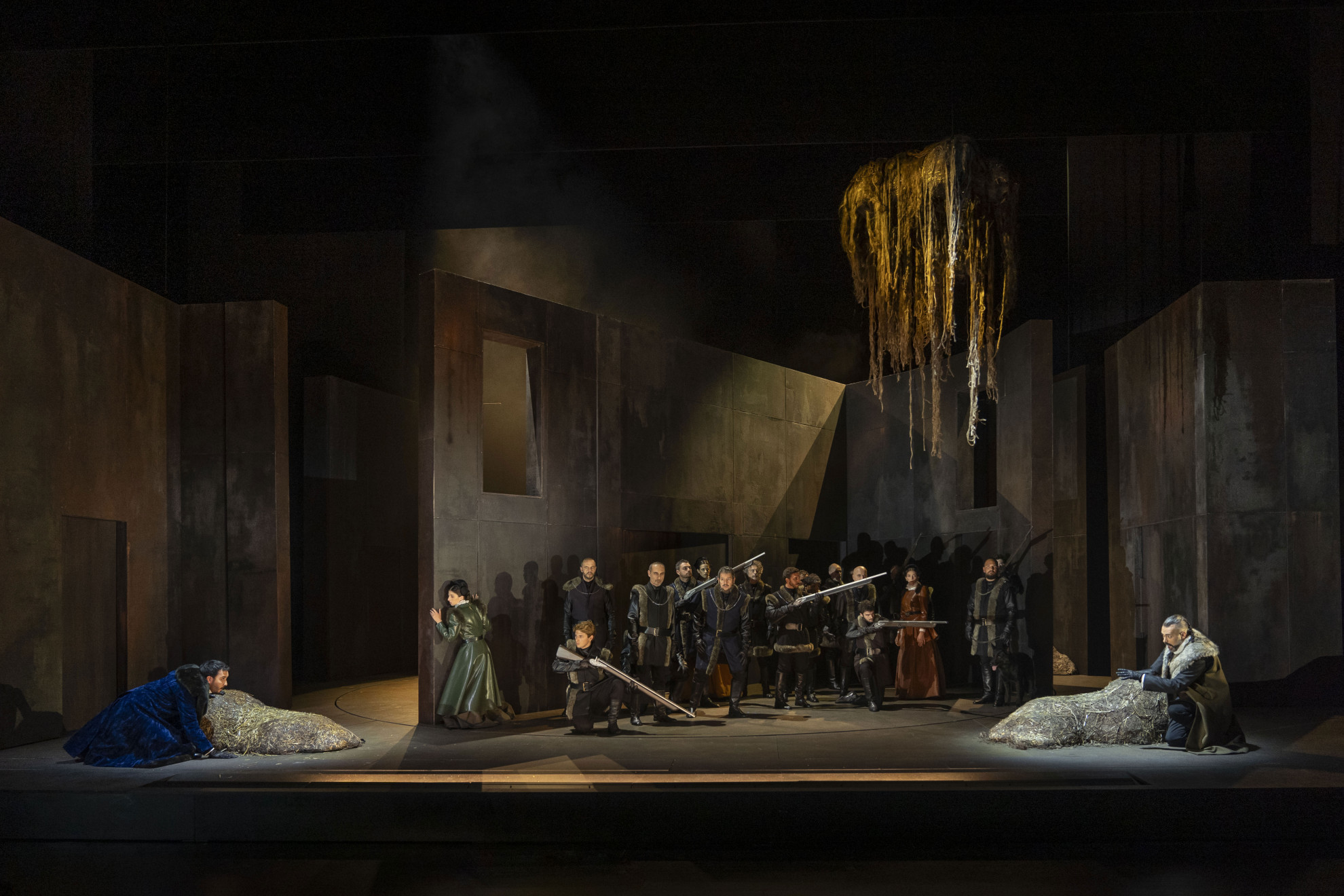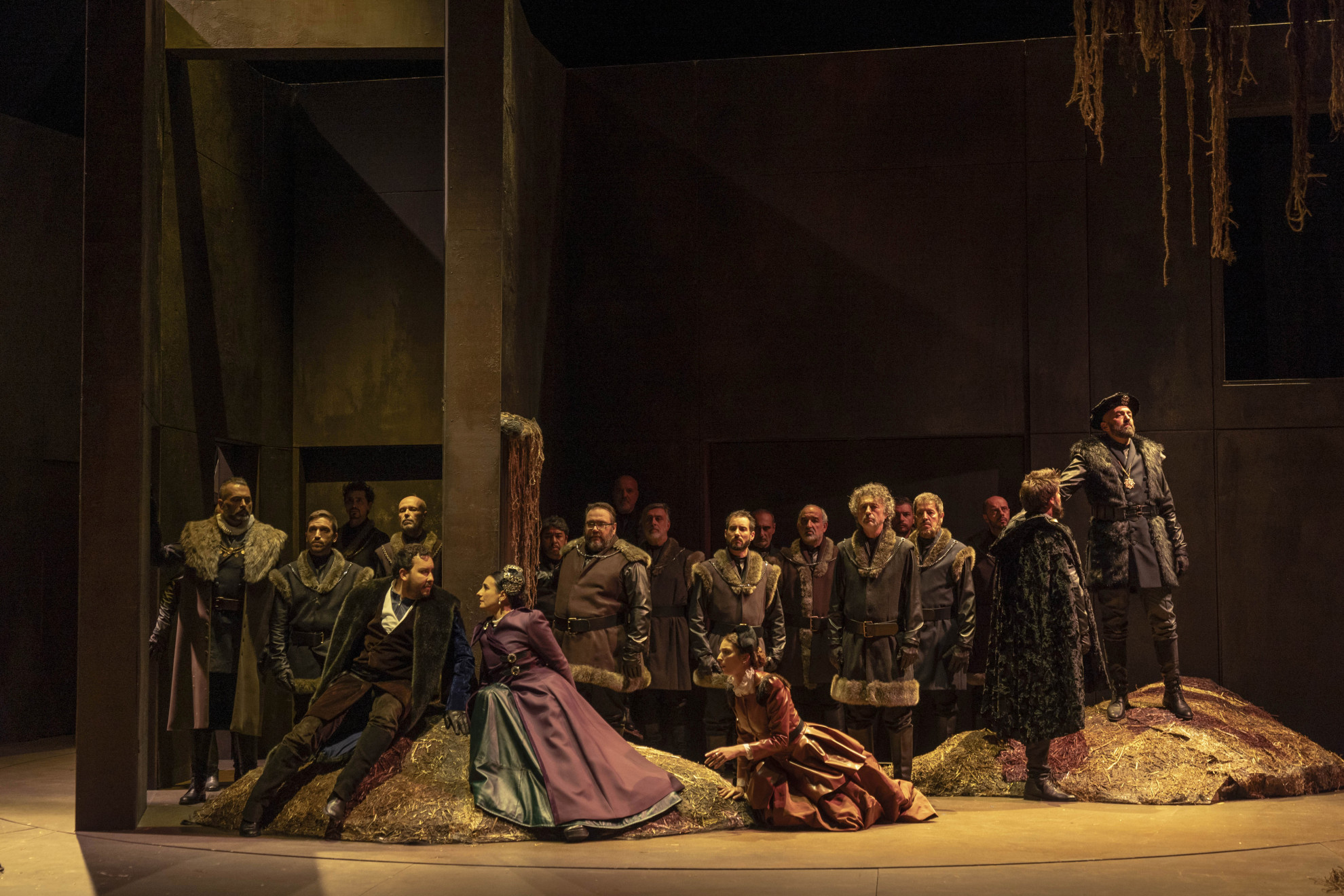 La visione di Carmelo Rifici, lunedì sera al Lac per la Prima, ha convinto: in una messa in scena slegata da coordinate spaziotemporali precise, abbiamo goduto dei quadri quasi caravaggeschi, grazie anche alle luci di Alessandro Verazzi, di grande impatto visivo; grazie a un meccanismo scenico ruotante, ingegnoso, rapido e intelligente, il racconto evolveva naturalmente, comprese le rapide apparizioni di carnefici, boia appena evocati ma potenti. Rimarranno impressi i due momenti corali femminili del secondo atto con le cantanti del Coro Rsi da brividi: veri compianti funebri, grazie alla cura dei movimenti assicurata da Alessio Maria Romano. Oppure, all’inizio, la canzone del paggio Smeton – ruolo en travesti – accompagnato dall’arpa sulla scena, un magnifico strumento Érard del 1900, e un’insuperabile Elisa Netzer.