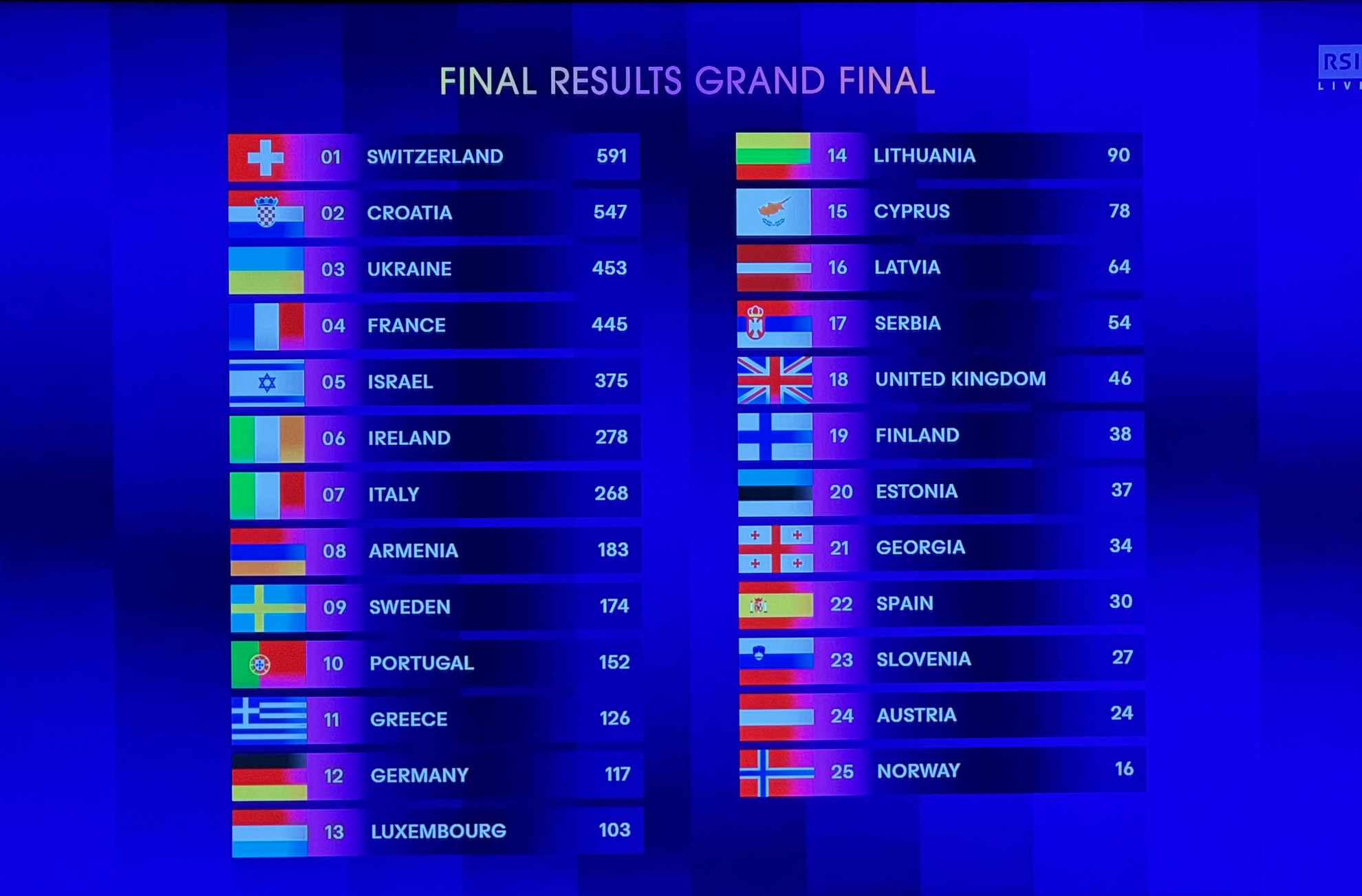 La Croazia è seconda, l'Ucraina terza. Nemo torna da Malmö con altri due premi: l’Artistic Award, assegnato dai commentatori d’Europa, e il Composer Award, assegnato da tutti compositori in gara. Questa la classifica finale: