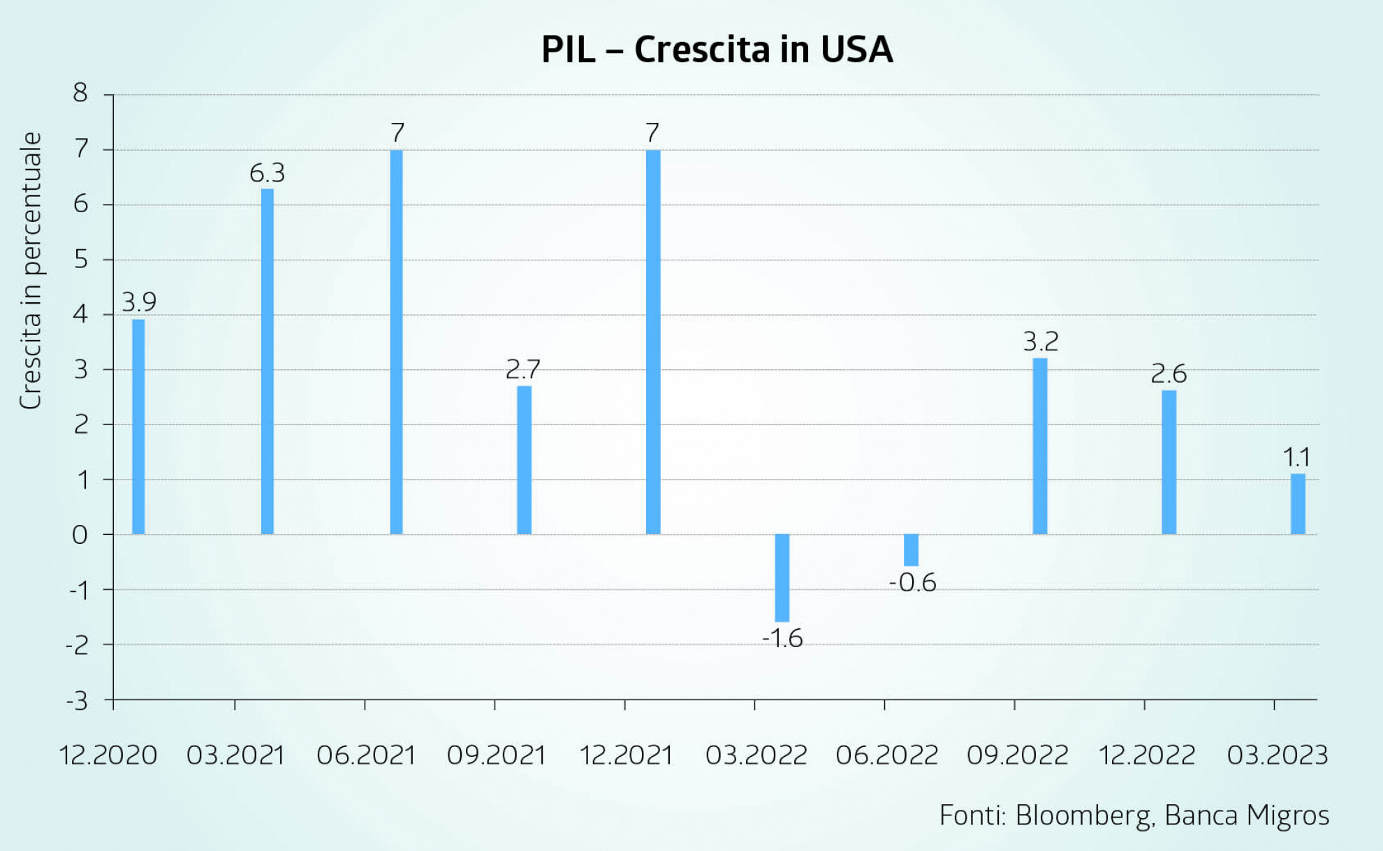 La recente crisi bancaria, invece, ha lasciato dei segni ben evidenti. A causa degli elevati tassi di interesse a breve termine, è probabile che il deflusso dei depositi della clientela continui e renda più difficile la concessione di prestiti da parte delle banche. Secondo la Fed, l’effetto frenante sulla crescita economica sarà come minimo un aumento dei tassi d’interesse. Un rallentamento della crescita è già visibile: nel primo trimestre il Pil degli Stati Uniti è aumentato solo dell’1,1%, a fronte di una crescita del 2,6% registrata nel quarto trimestre del 2022. Nel primo trimestre di quest’anno i consumi privati hanno confermato un andamento positivo, salendo del 3,7% nonostante le condizioni di credito più difficili e l’inflazione. La ragione di ciò è probabilmente il persistente vigore del mercato del lavoro e i risparmi ancora esistenti derivanti dalla pandemia.