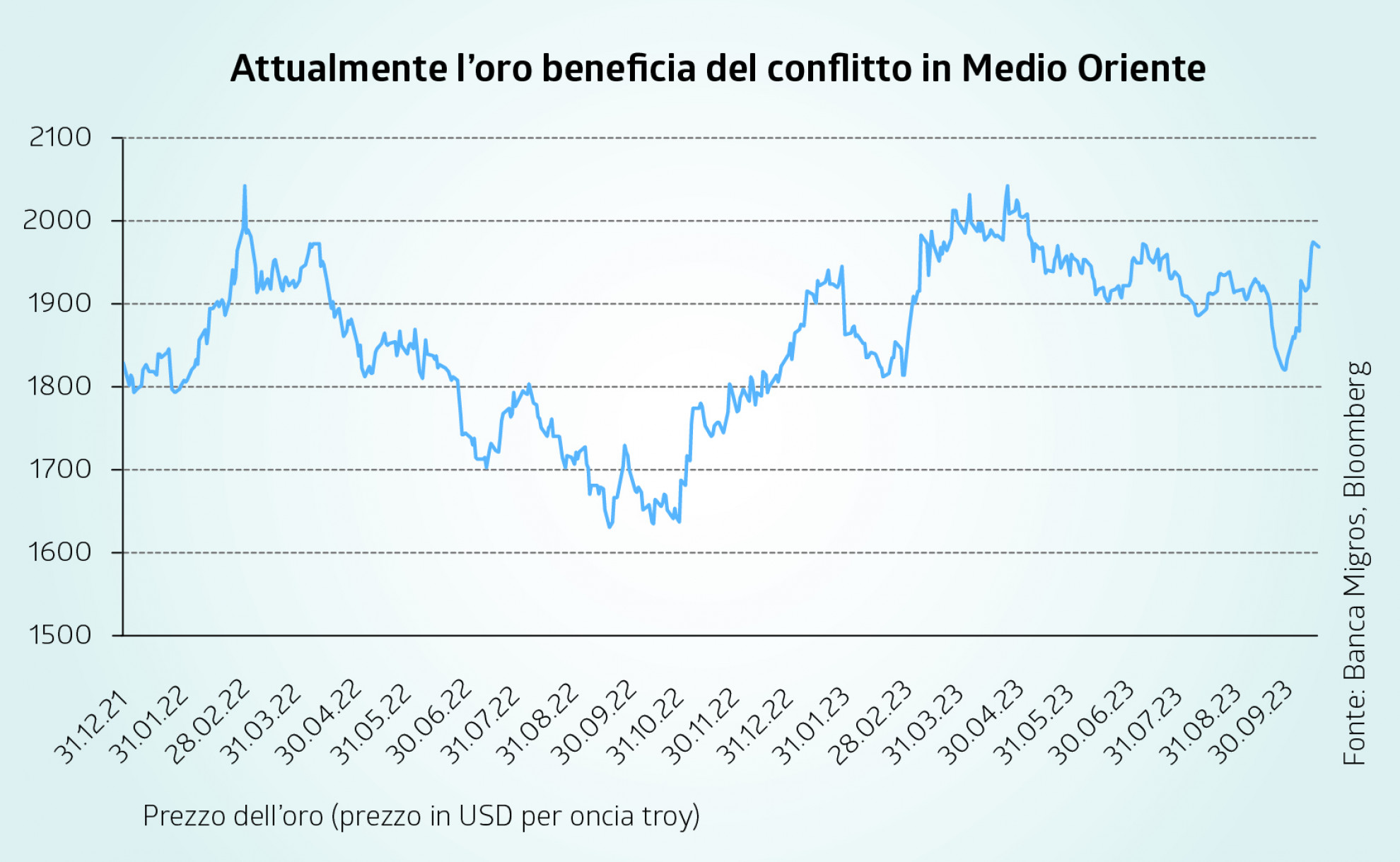 Nel mese di settembre il prezzo dell’oro è crollato di quasi il 4%. Il motivo è da ricondurre al forte aumento dei rendimenti dei Treasury statunitensi, che ha acquisito ulteriore slancio. Dall’inizio del conflitto in Medio Oriente il 7 ottobre, invece, il prezzo dell’oro è aumentato di quasi il 7%. Alla luce dei fattori d’incertezza geopolitica, investitori e investitrici tornano a cercare più sicurezza.
