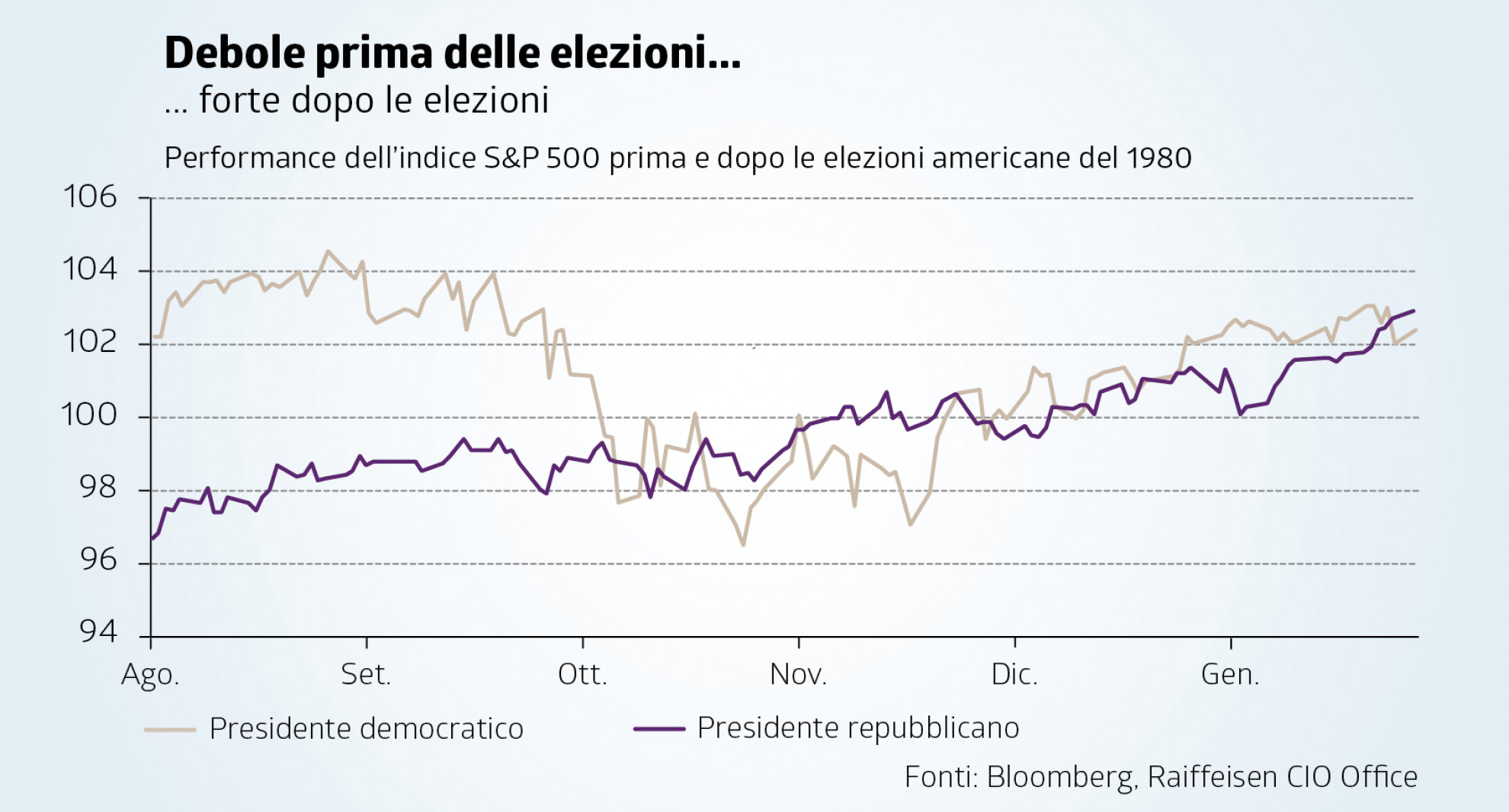Come era prevedibile, le elezioni presidenziali statunitensi del 5 novembre stanno dominando i titoli dei giornali. La scelta dei democratici di puntare su Kamala Harris ha ridato slancio a un partito che sembrava destinato a una sonora sconfitta. Il quesito che interessa gli investitori è sapere quali saranno gli effetti sui mercati finanziari. Quello che sembra certo al momento e che la gara tra i due contendenti sarà aperta e lo scarto tra i risultati esiguo, con nessuno dei due partiti che avrà una maggioranza sia al Senato che alla Camera dei deputati. Di conseguenza, è probabile che l’impatto sui mercati finanziari sarà contenuto. Per decretare l’esito delle elezioni saranno decisivi gli sviluppi economici negli Stati Uniti. Sebbene in calo, l’inflazione si mantiene a livelli elevati, mentre il mercato del lavoro inizia a dare segni di cedimento con il tasso di disoccupazione che è salito al 4,3%. Questa tendenza viene imputata ai democratici, per cui Kamala Harris dovrà trovare in fretta e furia soluzioni per invertire il trend. Tutto ciò porta energia positiva alla campagna di Trump, soprattutto considerata la sua solida base di sostenitori. Tornando ai mercati finanziari, storicamente essi sono sempre stati volatili e più deboli alla vigilia delle elezioni statunitensi. Tuttavia, dopo le elezioni l’indice S&P 500 ha spesso iniziato a recuperare a prescindere dal vincitore delle elezioni. Resta da vedere se questo sviluppo sia effettivamente legato alle elezioni o se si tratti piuttosto di un tradizionale andamento stagionale.