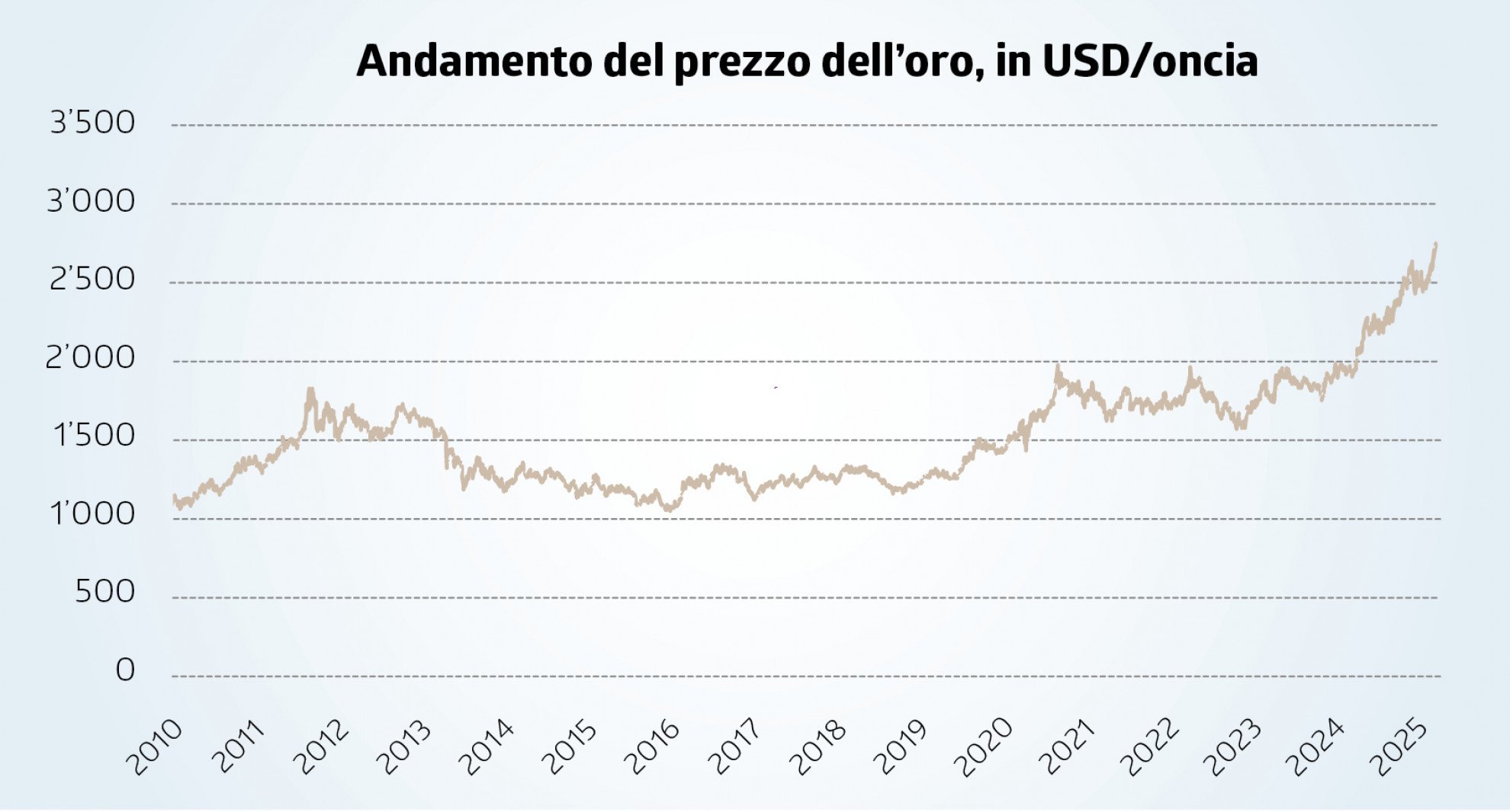 L’oro brillerà anche nel 2025: anche quest’anno il metallo prezioso giallo conosce una sola e unica direzione. Dall’inizio dell’anno il suo prezzo è aumentato dell’11%, e questa settimana ha raggiunto il record di Usd 2’929 all’oncia. Ciò è dovuto agli acquisti dall’Asia. In India e in Cina, in particolare, la domanda è aumentata notevolmente, sia da parte degli investitori sia da parte delle rispettive banche centrali. Tuttavia, l’andamento del suo prezzo è anche espressione di incertezza, poiché l’oro è considerato un bene rifugio e conserva il valore.