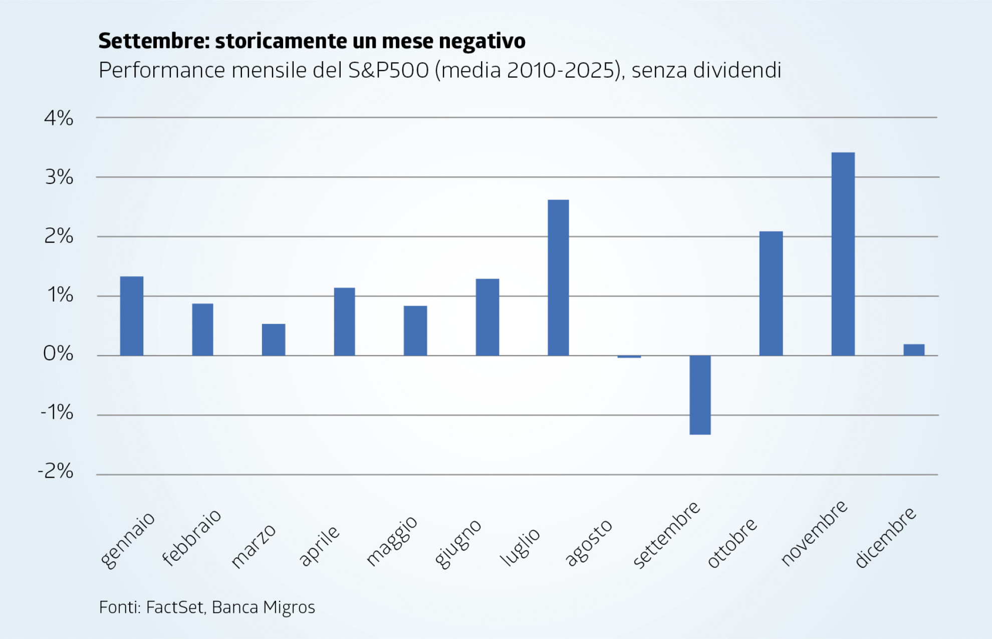 Il settembre corrente si discosta da questa tendenza. Nelle prime tre settimane del mese l’ampio indice S&P 500 è in forte crescita e si trova ai massimi storici, spinto da un’economia in espansione malgrado i dazi e ringalluzzito anche dal primo taglio dei tassi nell’anno in corso da parte della Federal Reserve. Al momento attuale il mercato americano è molto ottimista sia per quanto riguarda i prossimi tagli della Fed che per i futuri guadagni delle aziende. Il livello di guardia però è stato raggiunto: le azioni risultano molto care e se i profitti futuri non dovessero rispettare le aspettative ottimistiche il rischio di correzione è elevato.