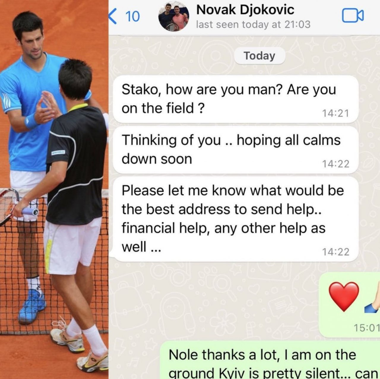 Grazie al suo profilo pubblico svolge anche un ruolo di ambasciatore: è ospite nelle televisioni internazionali, manda messaggi di eroismo. Qualche giorno fa ha pubblicato lo screenshot di un messaggio che gli ha inviato Novak Djokovic: "Ti penso, spero che tutto si risolva. Scrivimi se ti serve qualsiasi tipo di aiuto".