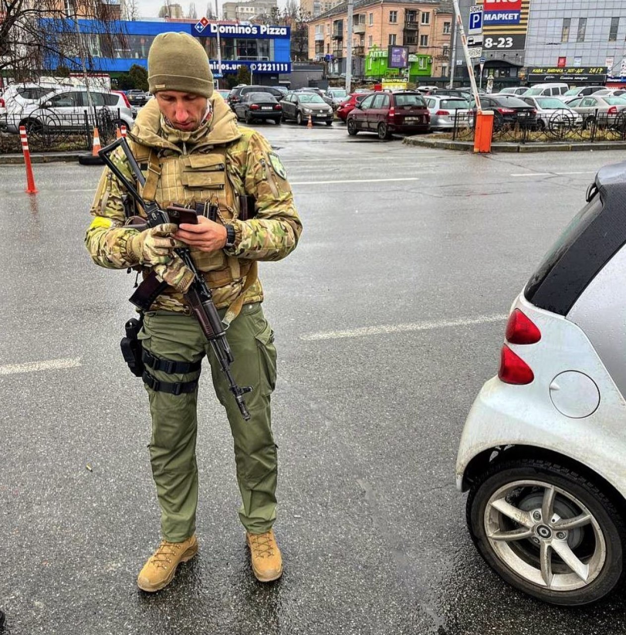 Sergiy Stakhovsky è in mezzo alla strada, in piedi, guarda il telefono con l’aria distratta. Dietro la sua posa, così comune, tutta una serie di altri dettagli apparentemente insignificanti. Domino’s Pizza alle sue spalle, una Smart bianca parcheggiata vicina e molte altre automobili alle sue spalle. L’insegna di un supermercato, i coni stradali. Sergiy Stakhovsky è un ex tennista ma non è vestito in borghese: indossa una divisa mimetica militare, un giubbotto antiproiettile, uno zuccotto verde, ha una ricetrasmittente legata alla gamba e un fucile mitragliatore adagiato tra le braccia vicino al telefono.
