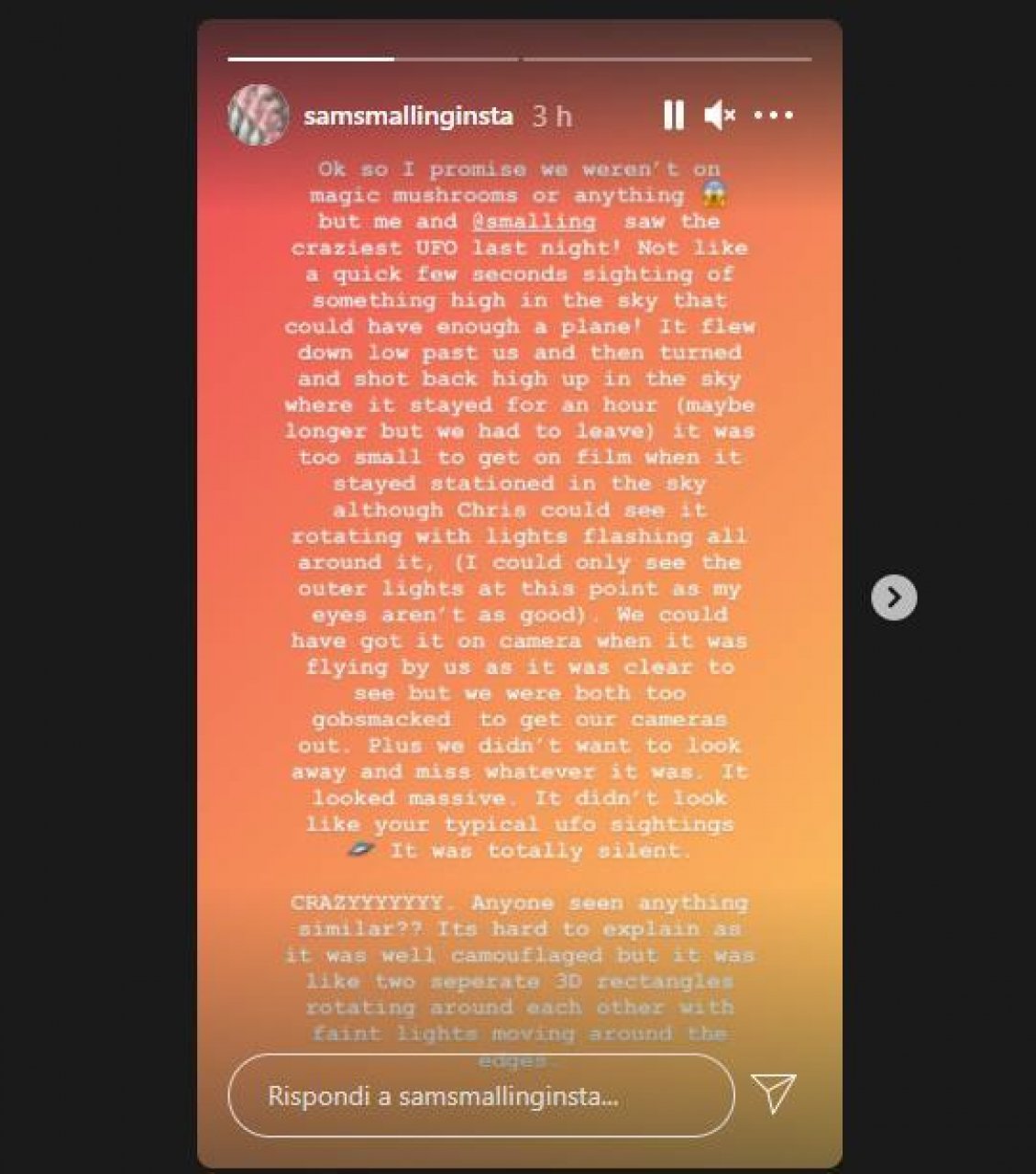 “Abbiamo avvistato un Ufo in Giamaica”. È la singolare avventura raccontata con una storia su Instagram dalla moglie di Smalling, in vacanza con il marito Chris, difensore della squadra di calcio della Roma. “Assicuro che non eravamo sotto l'effetto di funghi magici o altro. Ma io e Chris abbiamo visto un Ufo incredibile la scorsa notte”, ha scritto Sam Smalling. “Non è come avvistare per pochi secondi qualcosa di alto nel cielo che potrebbe essere un aereo! È volato giù davanti a noi e poi si è girato ed è tornato in alto nel cielo dove è rimasto per un'ora (forse più a lungo ma siamo dovuti andare via). Era troppo piccolo per essere ripreso quando è rimasto stazionario nel cielo, anche se Chris poteva vederlo ruotare con luci lampeggianti tutt'intorno. Sembrava enorme. Non sembrava uno dei classici Ufo. Era totalmente silenzioso”.