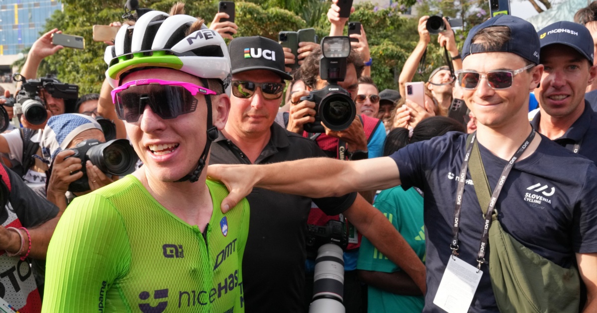 Nella corsa in linea, lo sloveno – già vincitore in stagione di Giro e Tour – conquista l'iride dopo un'azione solitaria di 80 chilometri