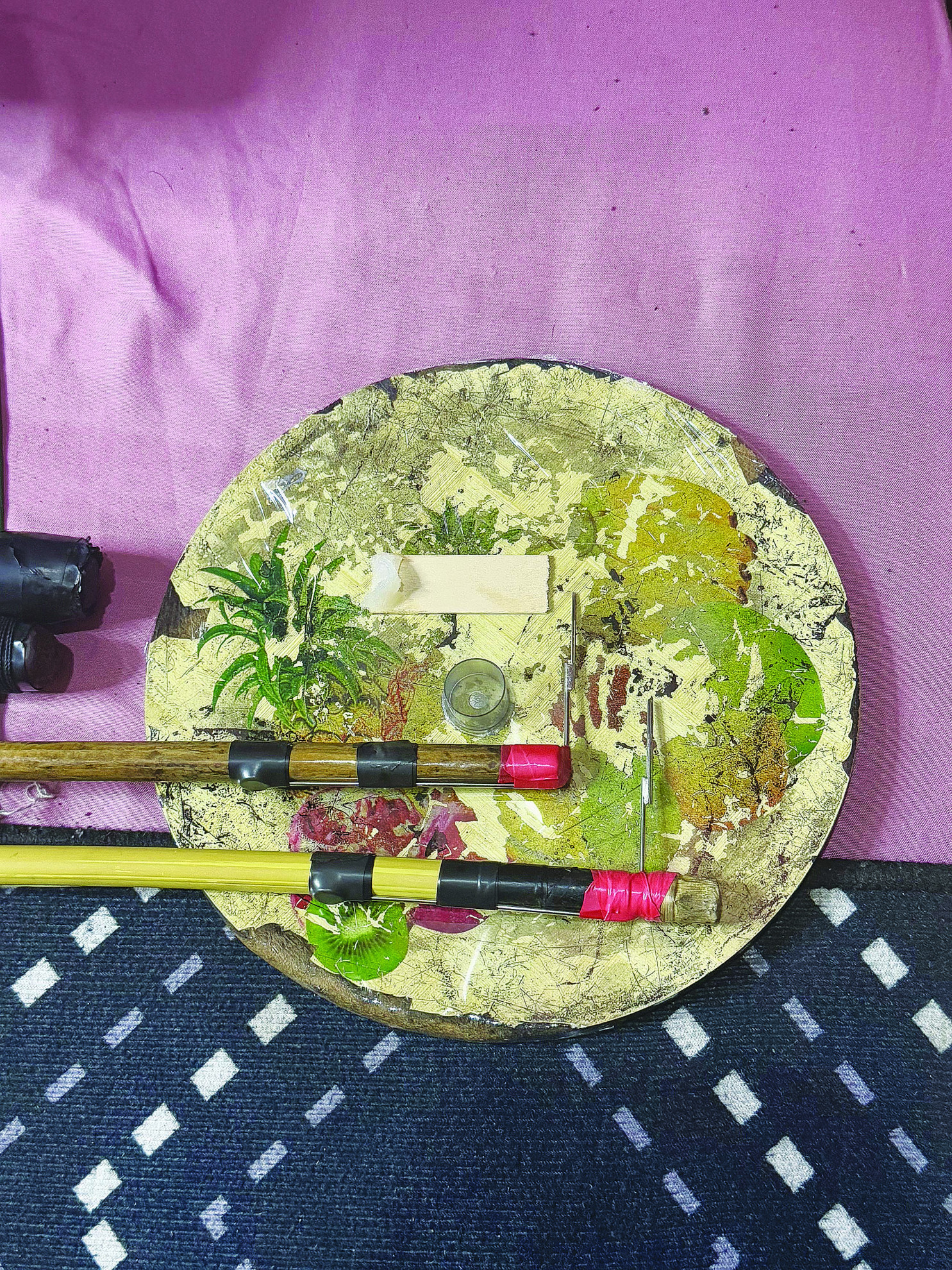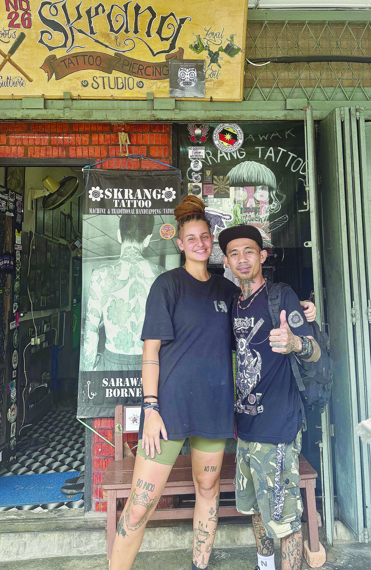 Il tatuaggio tradizionale Iban viene eseguito con la tecnica dell’hand tapping, un metodo antico che utilizza strumenti semplici, ma efficaci. Un ago da tatuaggio viene piegato e inserito in un foro su una sottile bacchetta di bambù. Per fissarlo, si utilizza del nastro adesivo, creando uno strumento rudimentale, ma preciso. Un secondo bastone, più pesante, viene impiegato per colpire ritmicamente la bacchetta che regge l’ago, spingendo l’inchiostro sotto la pelle a ogni colpo. Un tempo, gli aghi erano costituiti da spine vegetali o ossa sottili e l’inchiostro era ottenuto mescolando carbone, zucchero di canna e acqua. Oggi, anche qui, si utilizza inchiostro per tatuaggi moderni.